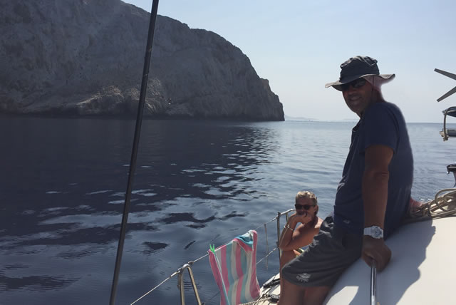 Today we sailed from Paros about 38nm to the little islands of Kato Antikeri and Ano Antokeri, our overnight anchorage. We approached the islands that are only separated by a relatively narrow channel and we were all pretty overawed by the surrounds and scenery, particularly once we entered the channel. Claire and I stationed ourselves on a bow each to keep lookout as we nosed up the narrows, making sure the depth ahead was ok. It was a great example of using the paper charts and chart plotter to seek out a wonderful anchorage. We spent some time finding just the right spot with good holding ground, only to see the channel open up on the other side to a stunning view towards Amorgos. It was stunned by the view that was spreading out before us to top off a great day of sailing and with new skills learnt.